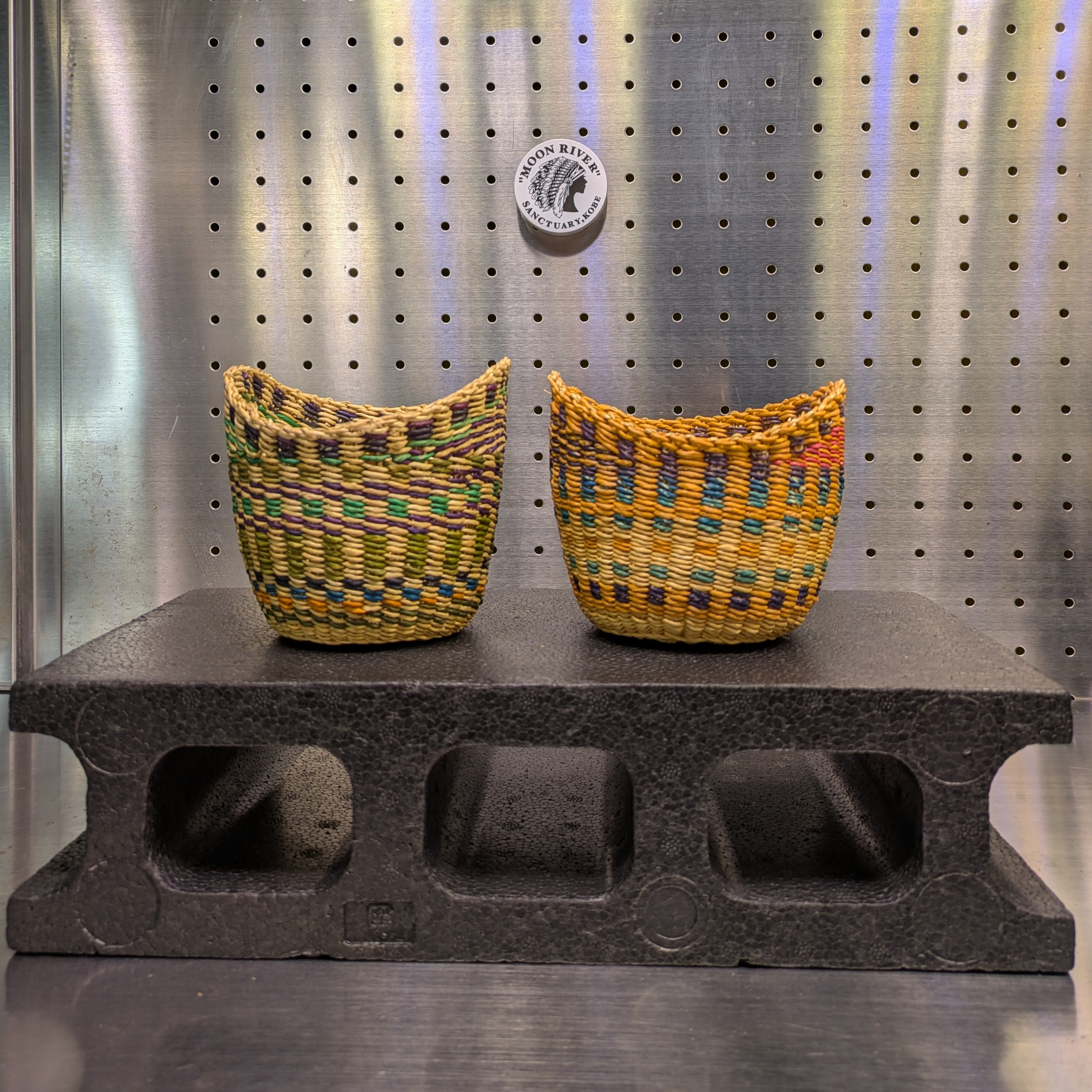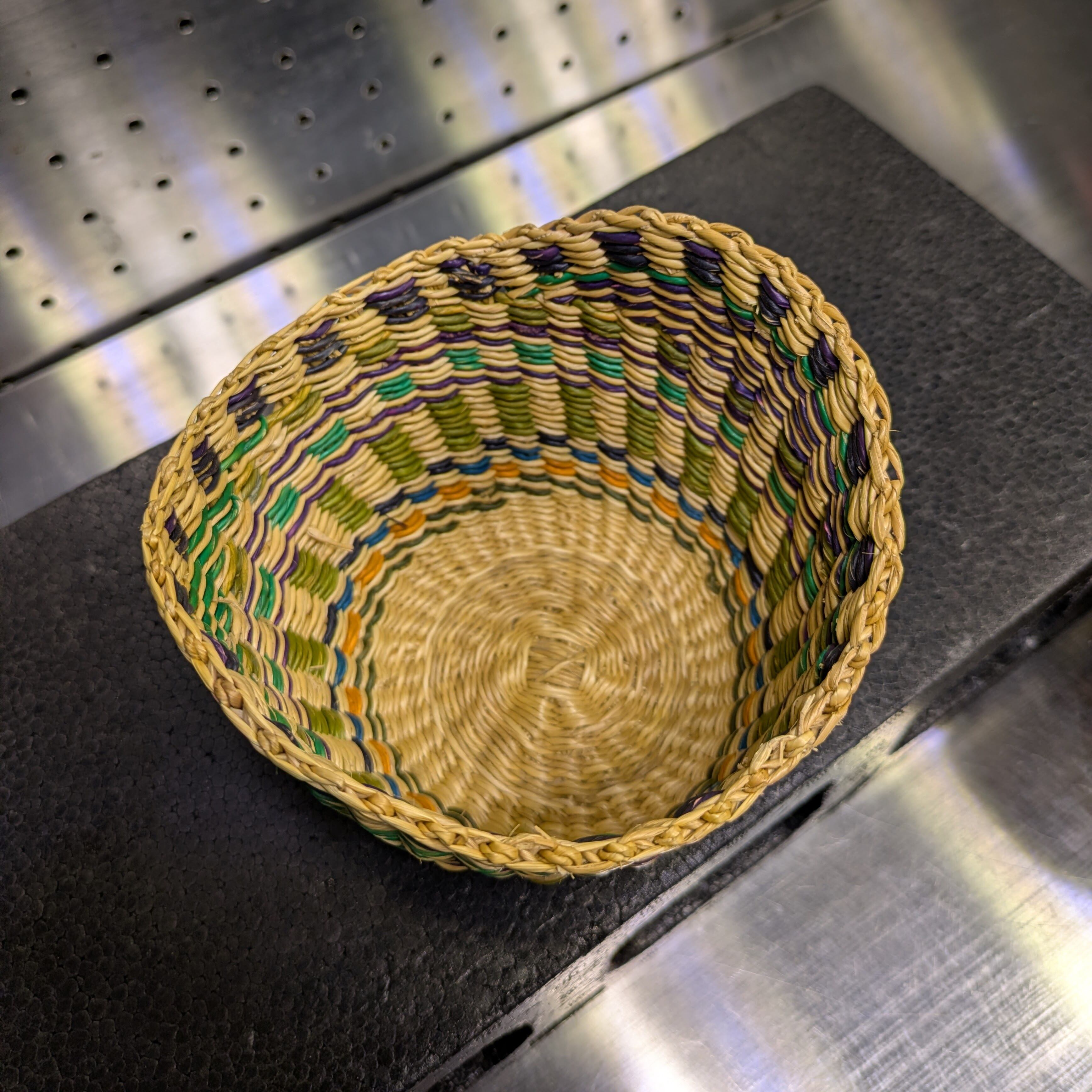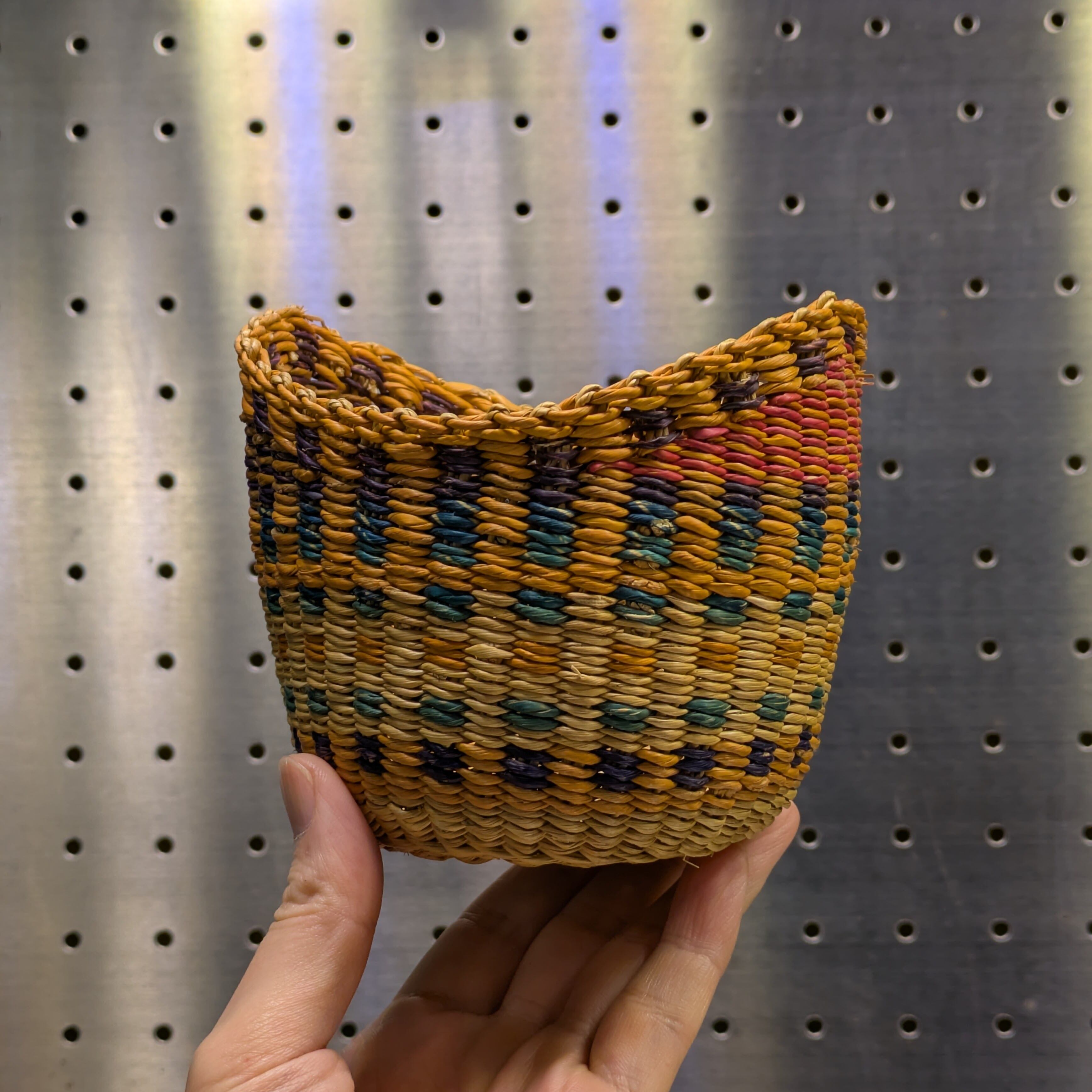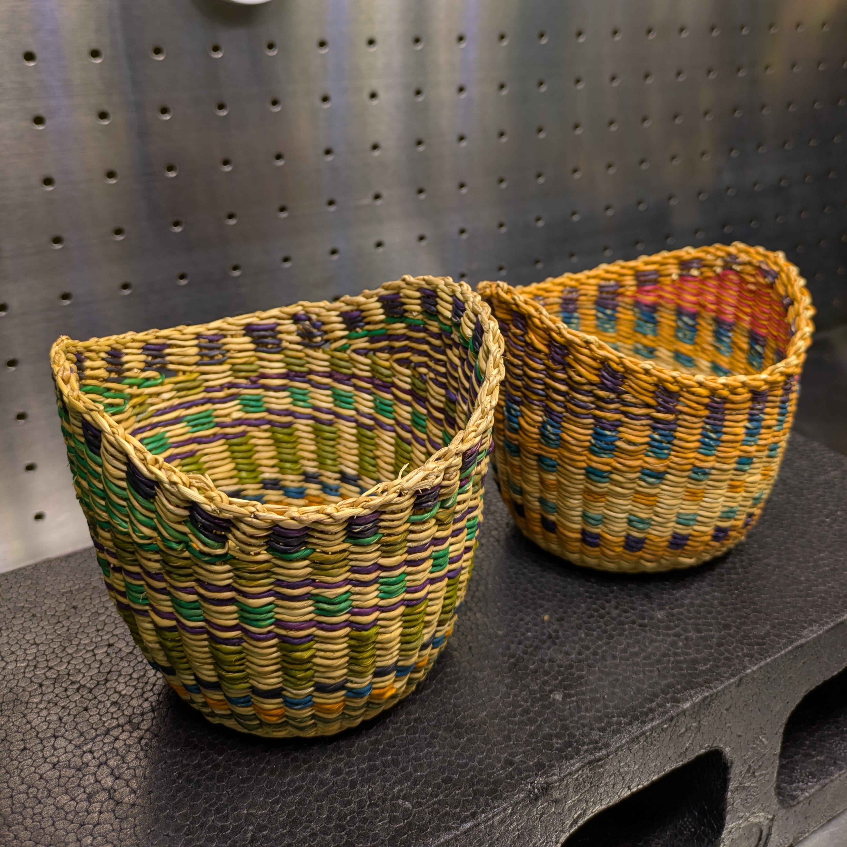 現地で採取されるエレファントグラス(水草)を使用し、一点ずつ丁寧に編み上げられています。ボルガバスケット特有の鮮やかな配色と素朴な編み模様が魅力です。
