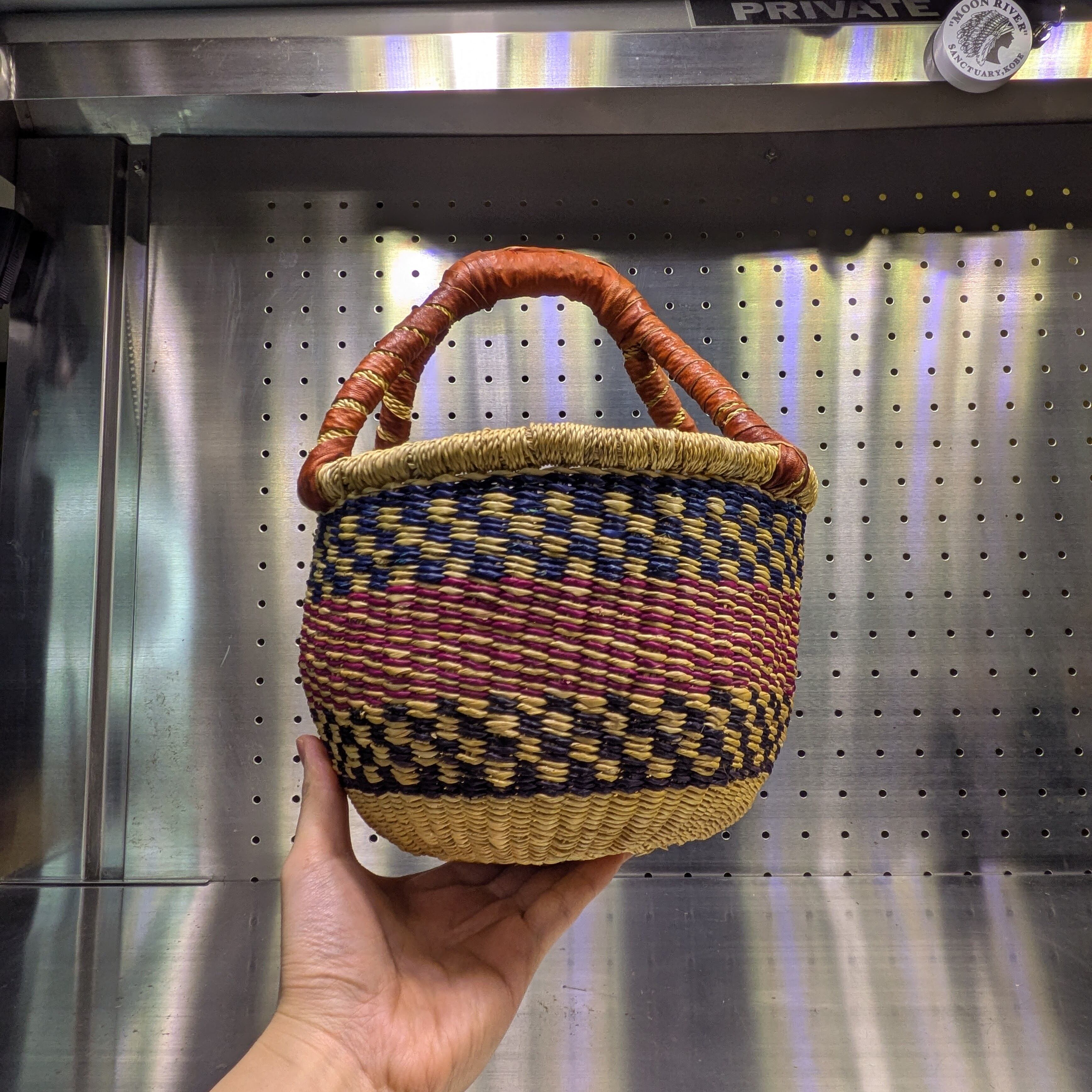 【ブルキナファソ産】革ハンドル付き ボルガバスケット(マルチカラー)
